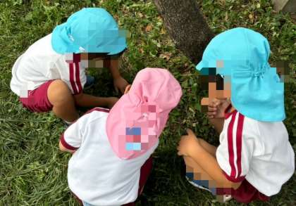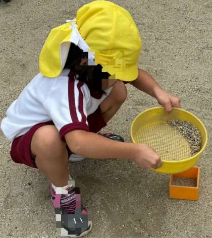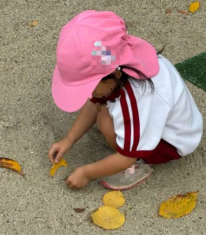 ようやく秋の訪れを感じられるようになりました。子どもたちは、サラ砂をつくったり、色づいた落ち葉を集めてご馳走をつくったり、草むらの中からバッタやミミズ、ダンゴムシなどの生き物を見つけたり、秋の自然探しを楽しんでいます。今日は、何を見つけたのかなあ。明日は何を見つけようかな。