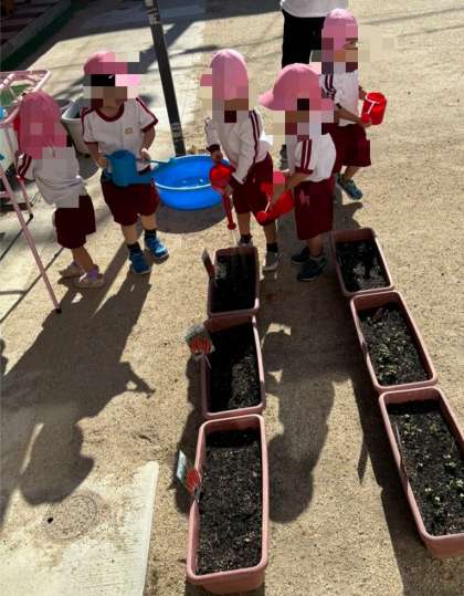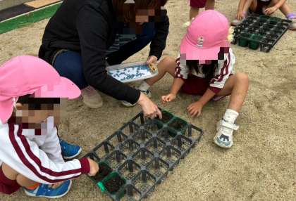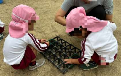 ラディッシュ、ミニキャロット、スナップエンドウの種を蒔きました。芽が出たことに気づいた子どもたちは、大喜び。チョンと触れてみたりしながら、毎日水遣りをして育てています。