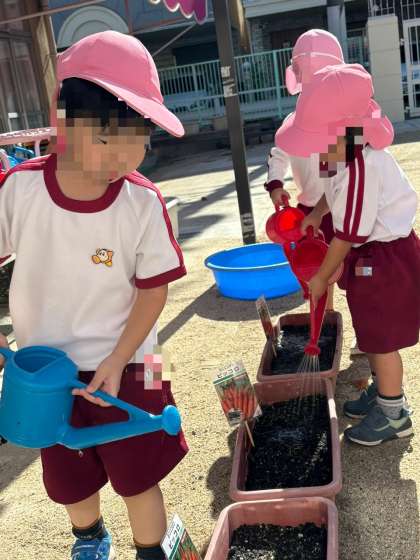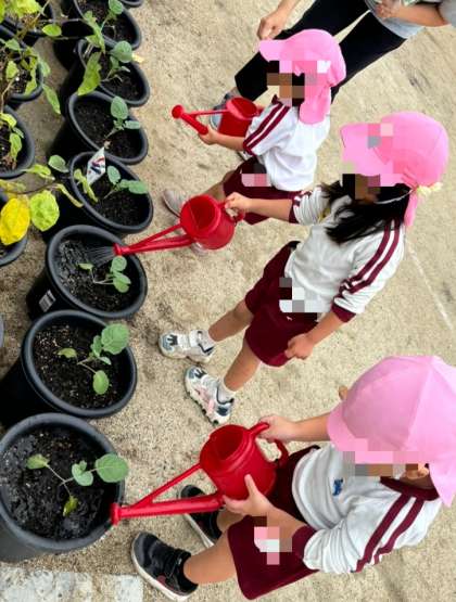 野菜の名札もかいて立ました。自分の野菜としてブロッコリーも育てています。お弁当に入っていたブロッコリーを見つけて、「一緒!」友達と一緒に「パクっ」苦手なお友達も思わず「パクっ」美味しく食べました。食育にも繋がっています。