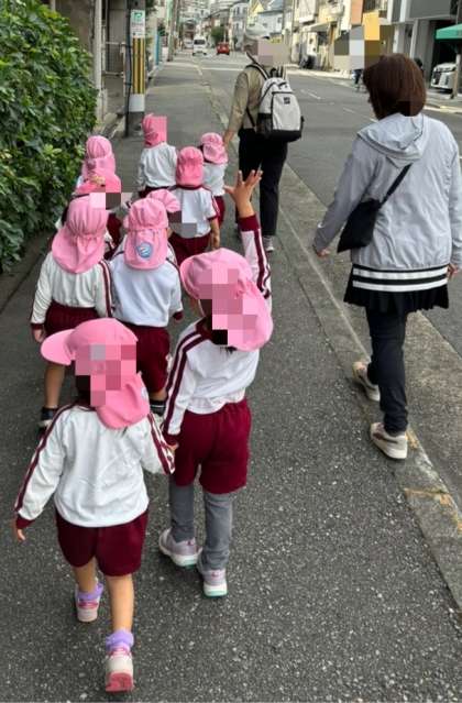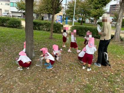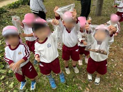 近隣の公園で拾ったドングリを幼稚園に持って来てくれたお友達から話を聞いて、みんなで拾いに行きたいね、という話になり、一度、桃組だけで歩いてみることに。これまで何度か遠足を経験し、空組さんに手を繋いでもらい、安全な歩き方を教わってきたことで、ちゃんと手を繋いで2列で歩くことができました。横断歩道は、自ら手をあげて渡りました。公園でドングリを見つけると一目散に拾い集め、たくさんとれました。