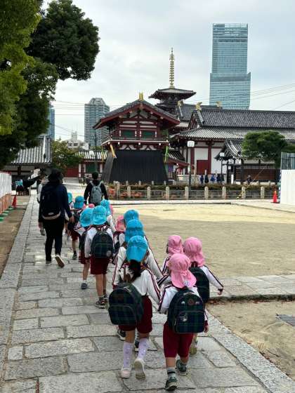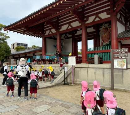 四天王寺さんにも園外保育に出かけました。亀や仁王像、五重塔など、昔の建造物に出会い、迫力や美しさに魅入っていました。