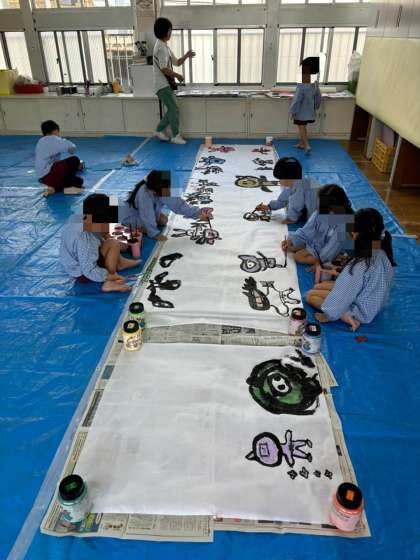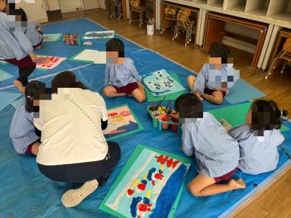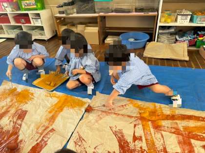 いろいろ経験したことを、いろいろな方法でかいたりつくったりして表現遊びを楽しんでいます。来週にはそれらを見ていただく作品展があります。当日の作品はもちろん、それまでの過程が何より大切です。作品を含めて子どもたちの過程をぜひ楽しんでいただきたいと思います。