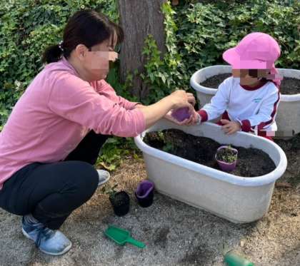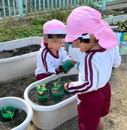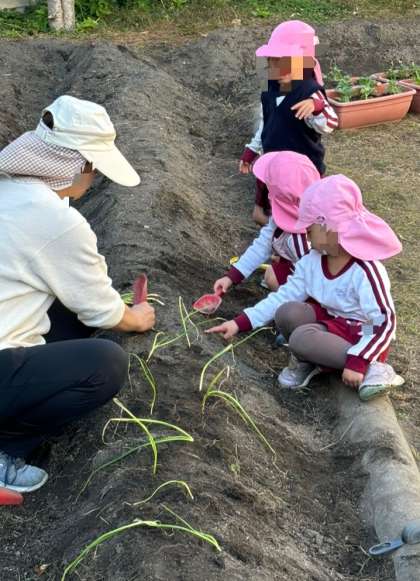 春の収穫に向けて、マメやタマネギを植えました。種蒔きから芽が出て大きくなってきたポットの苗をプランターに植え替えたり、畑に植えたり。春から夏にかけて、経験してきたことで、桃組さんも、やり方を分かって自ら植える姿がありました。収穫が待ち遠しいですね。