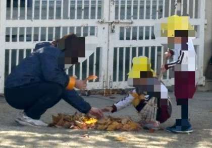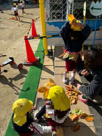 今年は、季節がズレて、12月にようやく、紅葉が美しくてなりました。園庭の桜の葉を拾って、いろいろなアイテムをつくり、身につけて遊んでいます。