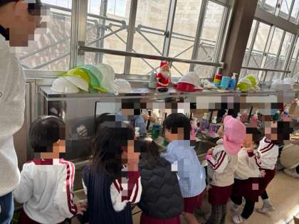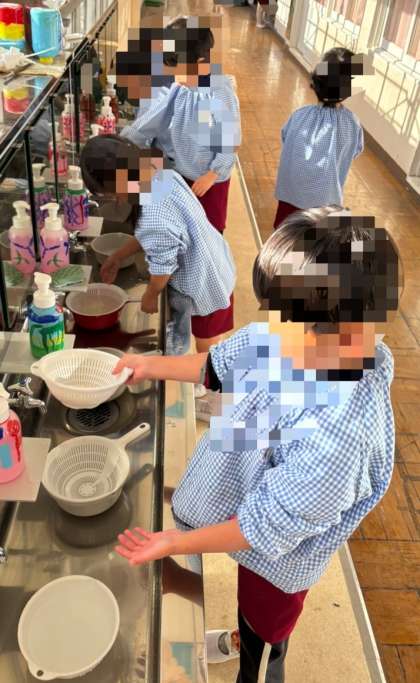 前日、空組が代表して、餅米を洗いました。黄組、桃組が見に行きました。ありがとうの言葉をかけて、当日に向けて、期待が高まりました。