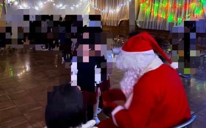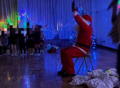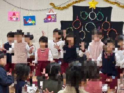 楽しみにしていたお楽しみ会当日、ふれあいダンスを楽しんでいると、鈴の音が聞こえ、待ちに待ったサンタクロースが登場しました。大歓声があがり、サンタクロースへの質問を各クラスで聞いて答えてもらい、いよいよ、プレゼントをもらうことに。ハイタッチまでしてもらい、大興奮の子どもたちでした。