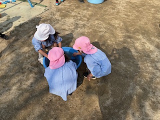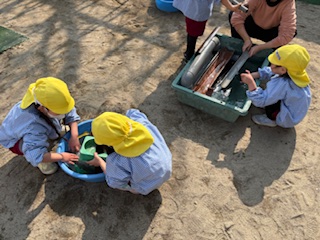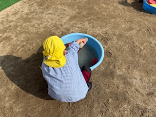 一年間たくさん遊んだ砂場の遊具を、桃組、黄組が洗いました。今までは空組さんもいたけれど、今日は桃組と黄組だけ……どんなふうに洗えばいいか、空組さんに教えてもらったな〜と思い出しつつ、4月から新しいお友達とも使って遊ぼうねと楽しみにしつつ、よい天気の中、洗うことができました。