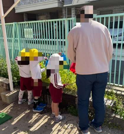 久しぶりの園庭で、育ってきた野菜や草花に水をあげたり、桜の花びらを集めたり、春の自然を感じて遊びました。