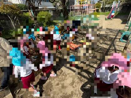 幼稚園生活が始まり、初めて保護者と離れる桃組さんたちは、朝から涙、涙の姿が見られます。年長さんの空組さんが、お世話をし、一緒に遊んでくれることで、少しずつ、涙も笑顔に近づいてきた週始め。桜の花びらを集めてごちそうをつくったり、ダンゴムシを見つけてふれあったり、一つずつ、楽しい機会を味わい、慣れてくれるように、保育を進めています。また、明日、元気に登園してね。待ってます。