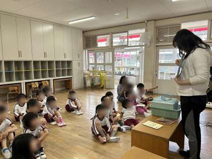 手洗いの方法を再度確認し、歌に合わせて頑張って手洗いをしています。
