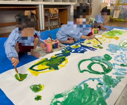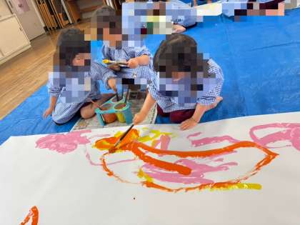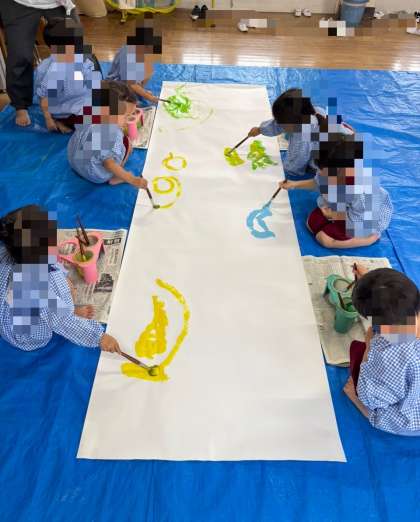 金曜日、桃組が初めて筆で絵をかきました。大きな紙にみんなでかいていくと、「黄色でぐるぐるかいたよ」「水が流れてるねん」など、お話を楽しんでいました。