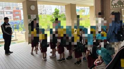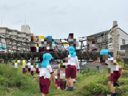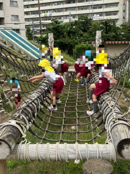 空組と黄組が、近隣の小学校にある三先山に遊びに行かせていただきました。小高い山を登り降りしたり、網の橋を渡ったり、存分に身体動かして遊びました。また、クローバーやシロツメクサ、タンポポなどの自然物を集めたり、バッタを捕まえたり、魅力いっぱいの三先山を満喫しました。