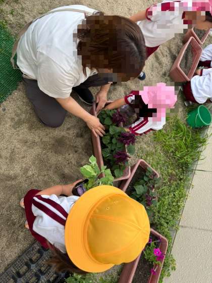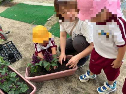 お花を植えよう 公開日 2025/06/03 更新日 2025/06/03 幼稚園日記 届いたサルビアの苗をプランターに植え替えようとしていると、「私もやりたい」と桃組さんが集まって来ました。そうっと優しくポットから取り出して、穴に植え替えました。綺麗な花が咲くのが楽しみな子どもたちです。 いいね(0)
