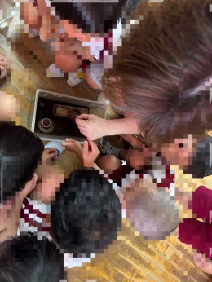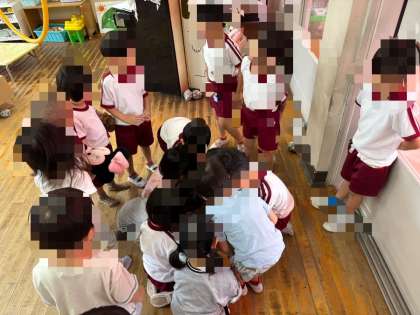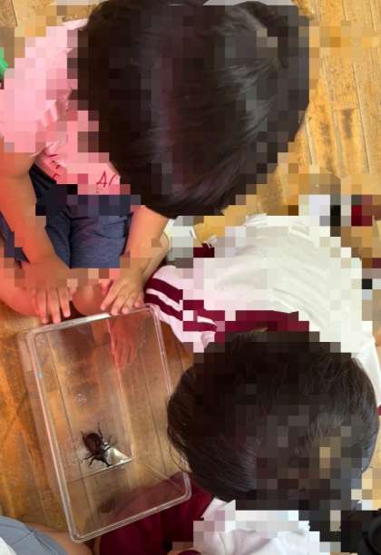 昨年度、他園からいただいたカブトムシが産卵し、幼虫になり、サナギになって眠っていました。朝、ついにカブトムシになり、空組さんが、桃組さんに見せに来てくれました。見たい見たいと、興味津々の桃組。順番にしっかり見て、可愛い!と愛おしく眺めていました。