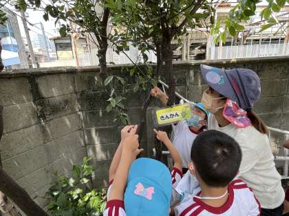 幼稚園のキンカンの木に、アゲハチョウの幼虫がいるのを見つけました。