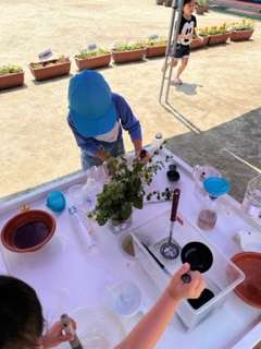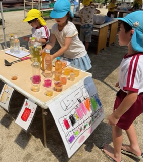 マリーゴールドやペチュニアなどの花や、レモンバームの葉を使って、色水をつくりました。つくった色水をジュースに見立てて、「いらっしゃいませ」「いろんなジュースがありますよ」と楽しんでいます。