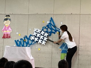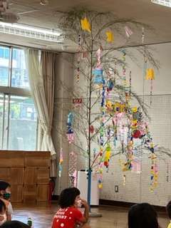 飾りをつけた大笹を見たり、七夕の話を聞いたり、お供え物を見たりしました。