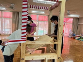 櫓の組み立て 公開日 2022/07/13 更新日 2022/07/13 幼稚園日記 夏まつりごっこの櫓を教職員で組み立てました。 櫓の周りには、子どもたちがつくったちょうちんなどを飾る予定です。 みんなで、櫓の周りで盆踊りを踊りましょう。 いいね(0)