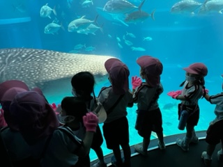 大水槽のジンベイザメに出会いました。 マンボウもにらめっこもしていました。