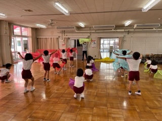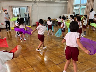 カラフルな布を使って、子どもたちがいろいろな動きを考えました。その動きを先生が整理して、子どもと一緒に組み立てています。