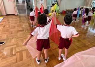 布を大きく回したり、友達と一緒に動かしたりしています。