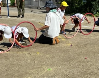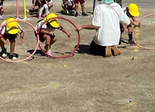 フープのトンネルをくぐって、丸太をジャンプして、フルーツを取りに行きます。