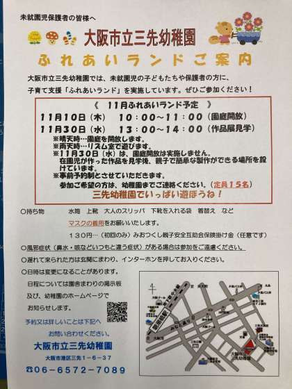 11月ふれあいランド日程について 公開日 2022/10/12 更新日 2022/10/12 幼稚園日記 11月のふれあいランドの日程をお知らせします。事前予約制とさせていただきます。 ご連絡おまちしております。 いいね(0)