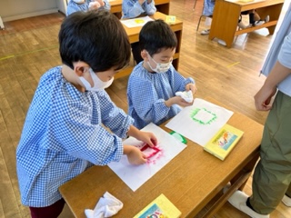 黄組の子どもたちが、パスを使ったこすり出しという技法を楽しみました。