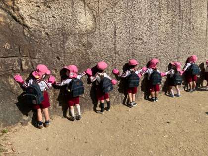 桃組みんなで、手を伸ばして、石垣の大きさを確認しました。 大きかったです。