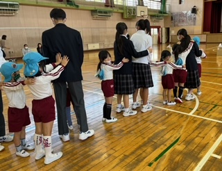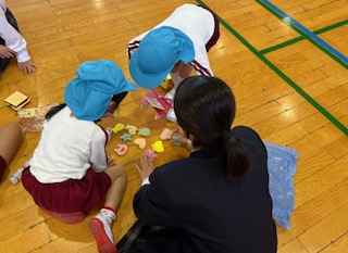 中学3年生のお兄さんお姉さんが、幼稚園の子どもたちのために、手づくりのおもちゃを用意してくれました。