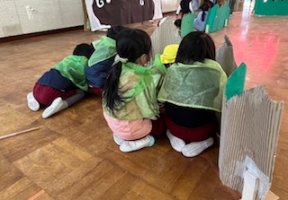 劇あそび 公開日 2023/02/01 更新日 2023/02/01 幼稚園日記 黄組の劇あそびには、今までに楽しんできた仲良し遊びが取り入れられています。友達と触れ合う楽しさが伝わってきます。 小道具の草の裏で、友達の動きを見たり、自分の出番を確認したりと、いつでも子どもたちは一生懸命です。 いいね(0)