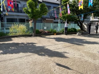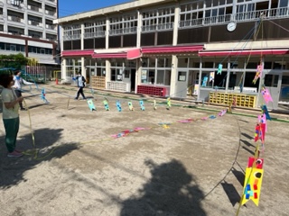 登園前に、子どもたちがつくったこいのぼりを遠庭に飾りました。