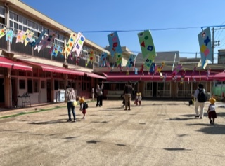 登園時、子どもたちと保護者の方が、こいのぼりを楽しそうに見てくれていました。