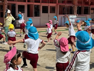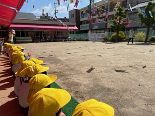 こいのぼりの下で、みんなで集いました。 動物体操をして、元気いっぱい体を動かしました。