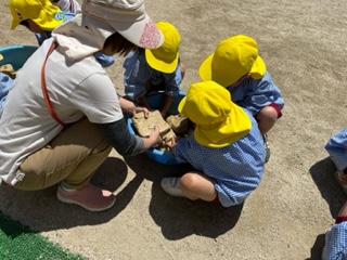 先生たちで遊びの準備をするのではなく、子どもたちと一緒に準備をしていくことで、遊びたい期待や意欲が膨らみます。子どもたちも笑顔で、感触を味わっていました。