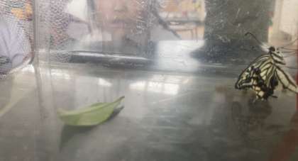 羽を乾かし終わったチョウチョがケースの中で飛ぶ様子を見て、「お外で飛びたいのかな」という声が。