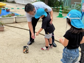 黄組と空組の子どもたちは、実際に花火をしながら、安全な持ち方や火が消えた後の始末などを学びました。