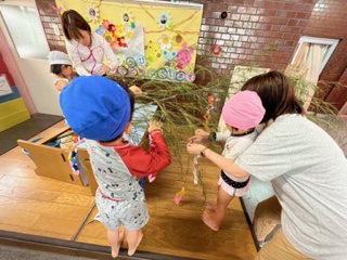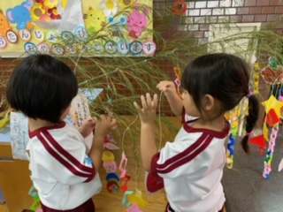 折り紙などでつくったいろいろな飾りや、願い事を書いた短冊を大きな大きな笹にくくりつけました。