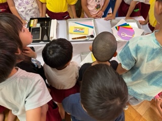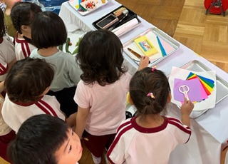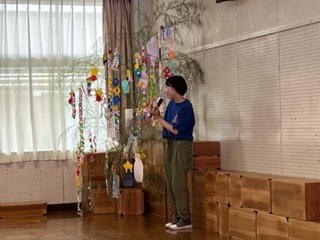 大笹につけた飾りを見たり、夏野菜などをお供えしたり、先生たちによる七夕の伝説の劇を見たりしました。
