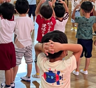みんなでリズム室に集まり、盆踊りを踊りました。音楽に合わせて、手足を動かして楽しんでいます。
