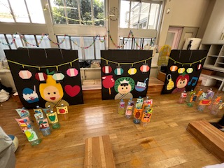 ボーリングのコーナーでは、みさきようちえんのキャラクターが登場しました。ペットボトルを倒すと花火が打ち上がる仕掛けもありました。