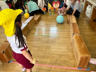保護者の方の温かい声援の中、子どもたちはいろいろな大きさのボールを転がして遊びました。