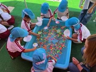 スーパーボールすくいです。チームに分かれてどちらがたくさんすくうことができるか、楽しみました。