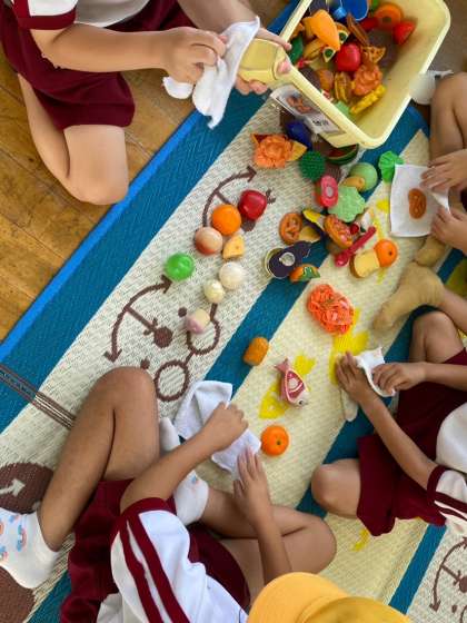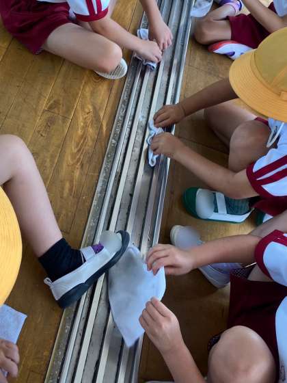 みんなで力を合わせて1学期に使った保育室やおもちゃを掃除しました。丁寧に隅から隅まで掃除して、「ピカピカになったよ〜!」とスッキリした顔で教えてくれました。