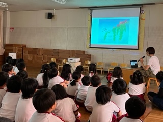 トンボのフォトフレームのプレゼントや、保護者の方とのふれあい遊び、先生からのカニのお話など、楽しい時間を過ごしました。