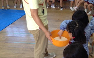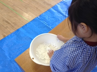 「お団子をみんなでつくろう!」と、米粉をつかうことにしました。米粉はさらさらで、「これが固まるのかな…」と、絵本に書いていたように少しずつ水を加えてこねこね……