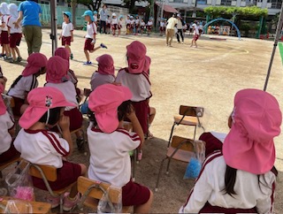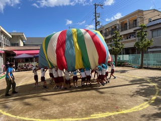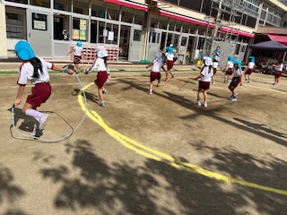 空組の子どもたちが毎日頑張っている縄遊びやパラバルーンです。桃組や黄組の子どもたちがじっと見ています。
