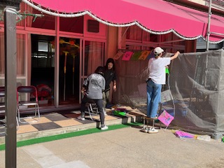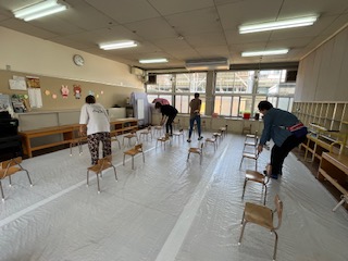 廊下にシートを敷いたり、貼り紙をしたり、万国旗を飾ったりしました。