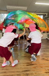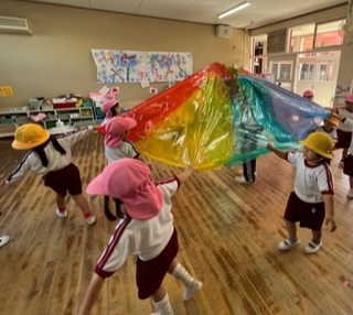 部屋で楽しんだ後は、戸外でもし、他の学年の友達に見てもらうことを喜んでいる桃組でした。