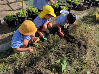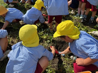 芋掘り 公開日 2023/11/01 更新日 2023/11/01 幼稚園日記 春に苗植えをしたサツマイモが大きく育ち、芋掘りをしました。 長いつるを力いっぱいひいたり、土の中のおいもを探したりしました。土の中からおいもが顔を出しているのを見つけて、大喜びです。 いいね(0)